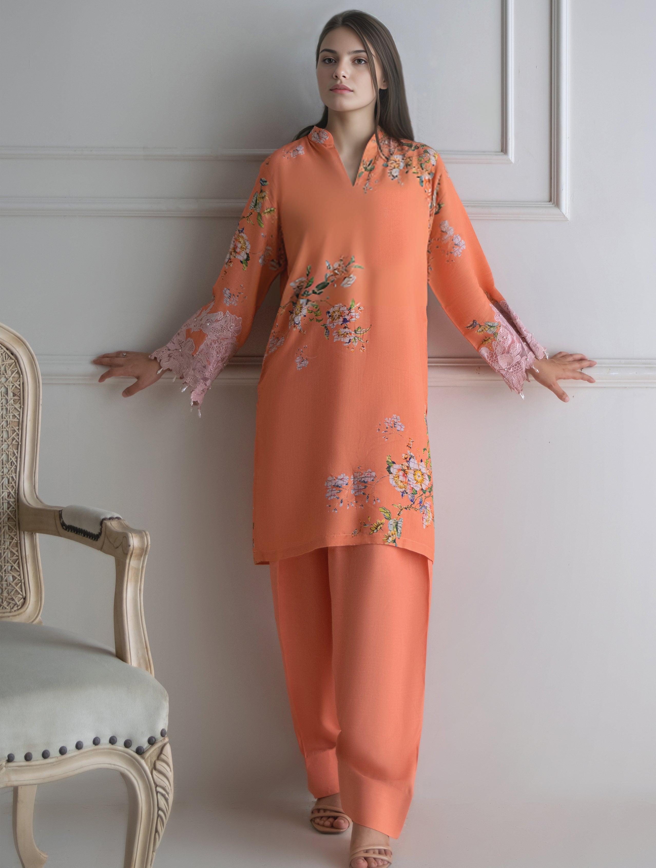 Standard Production lead time is 15–20 working days for Formal-wear and 8–10 working days for Ready-to-wear after order receipt. Please note that if we do not have complete information regarding the garment or design in re-production, the timeline will exceed accordingly.
