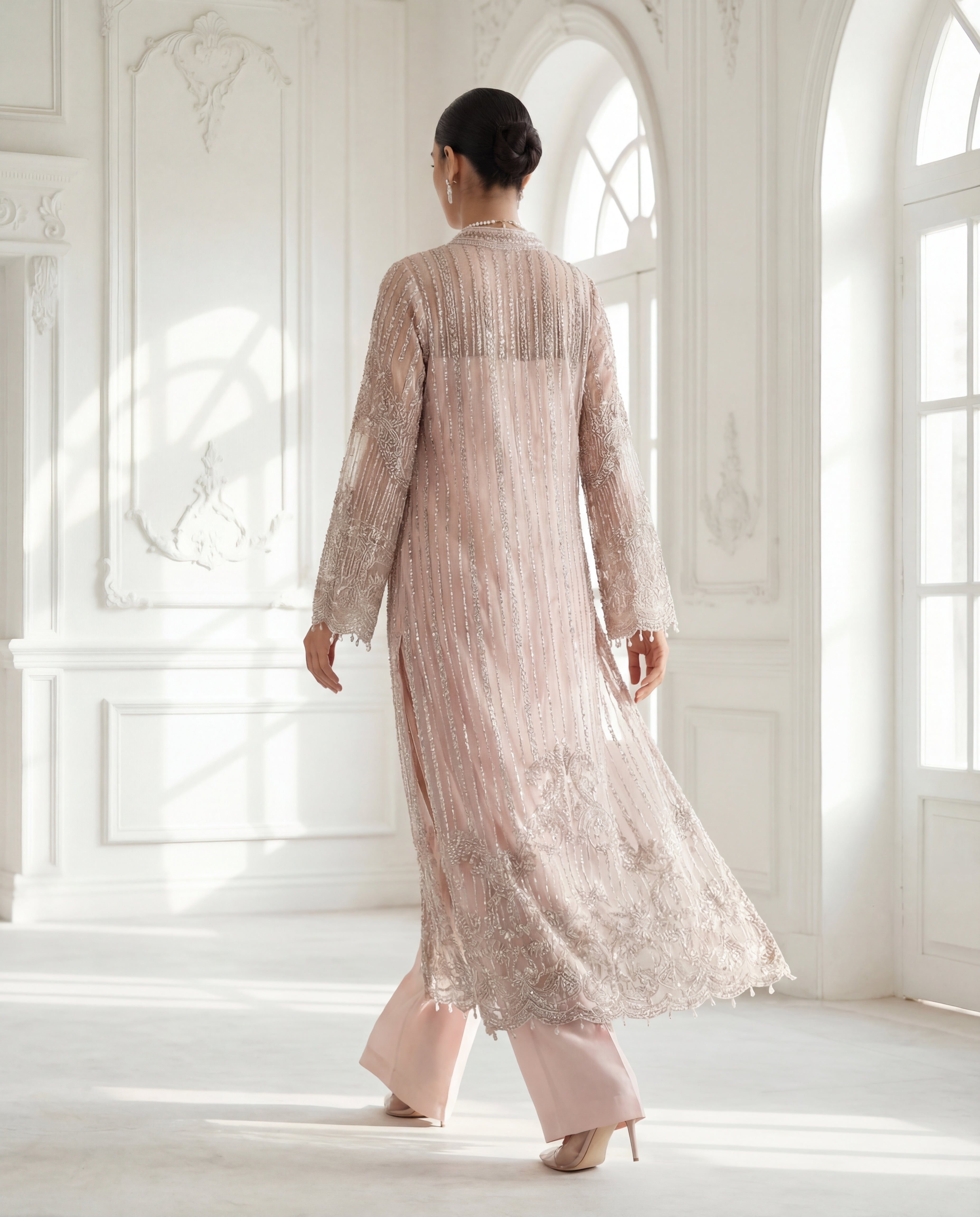 Embellishments: Hand-placed sequins, micro-pearls, and crystalline droplets throughout the front and sleeves.