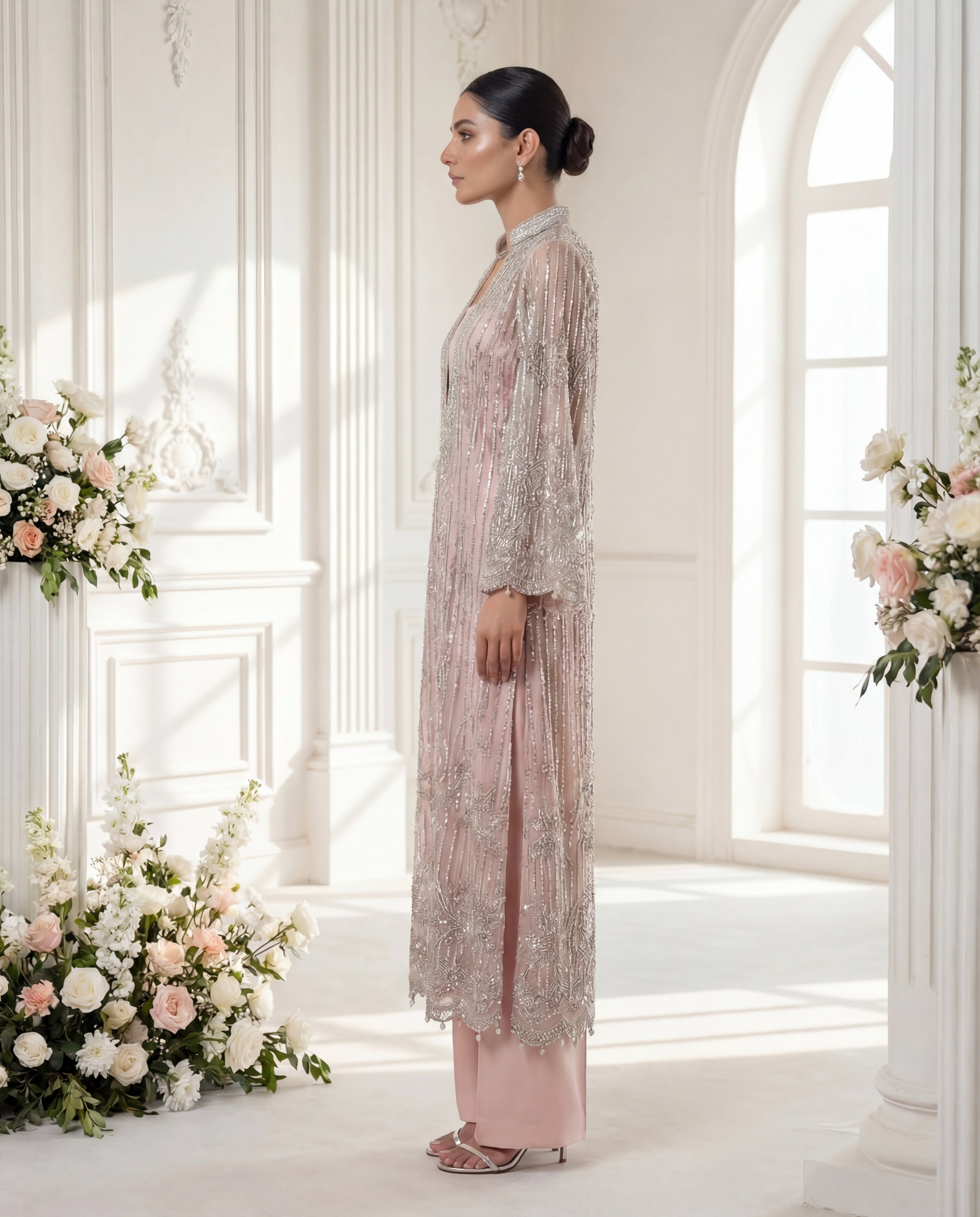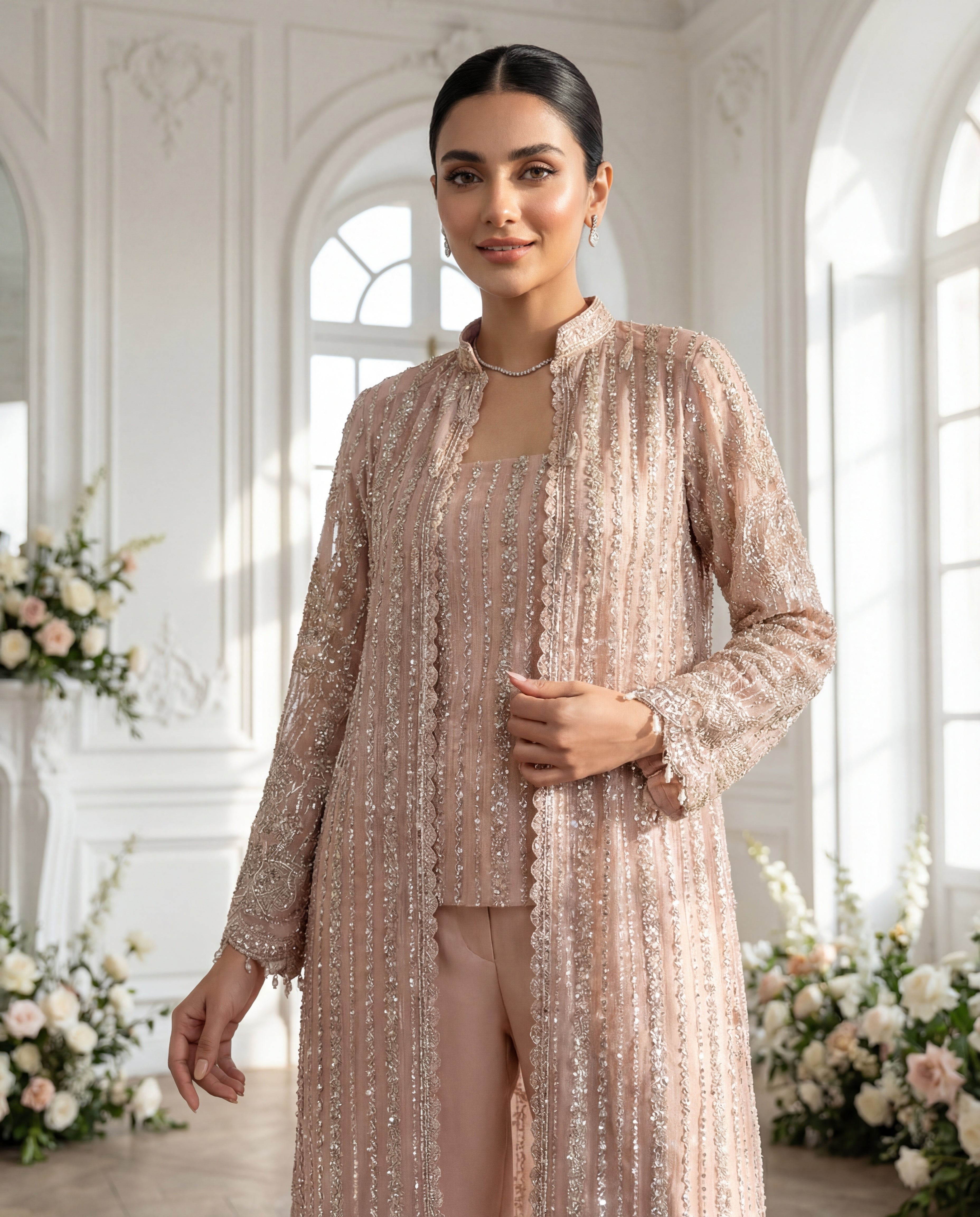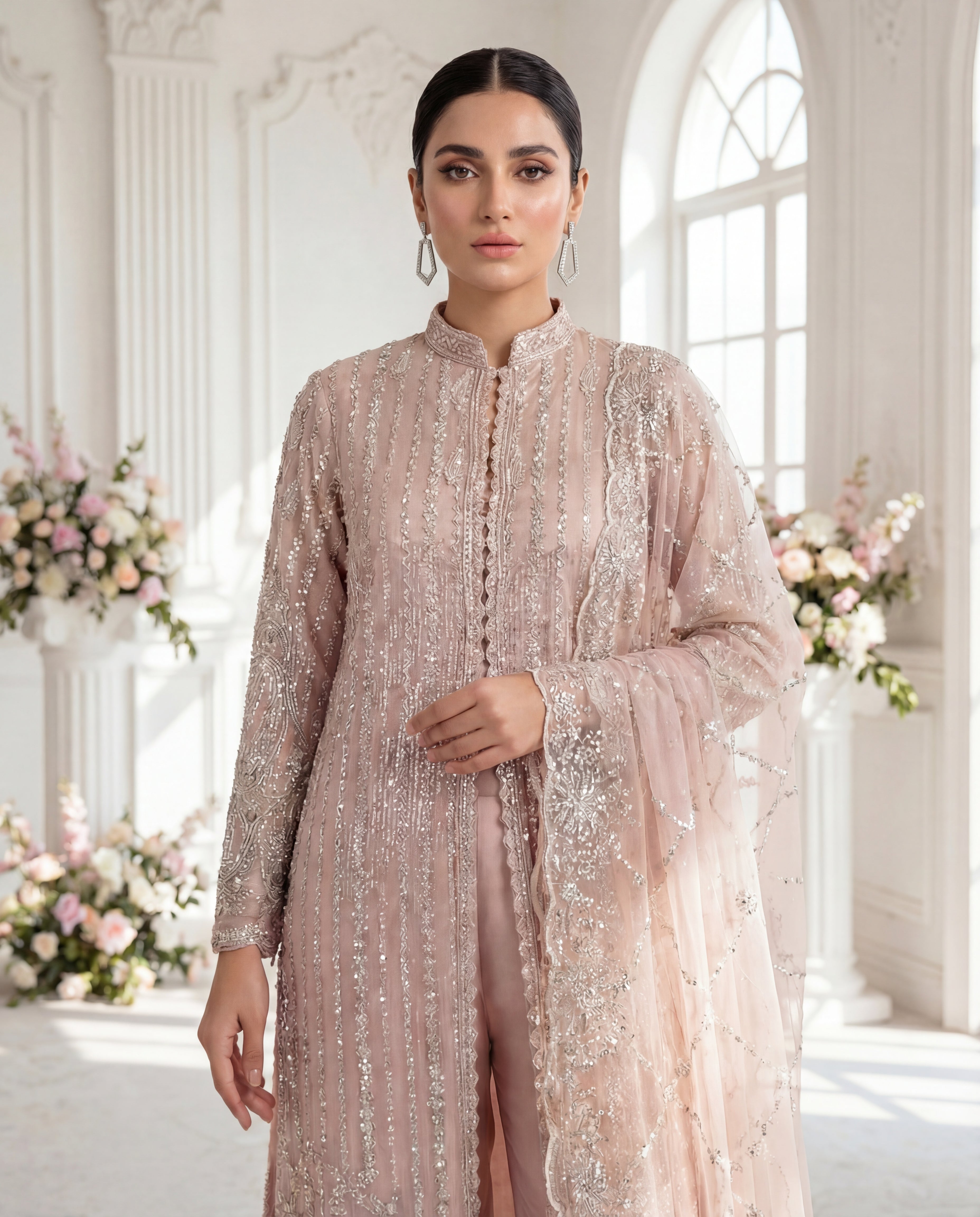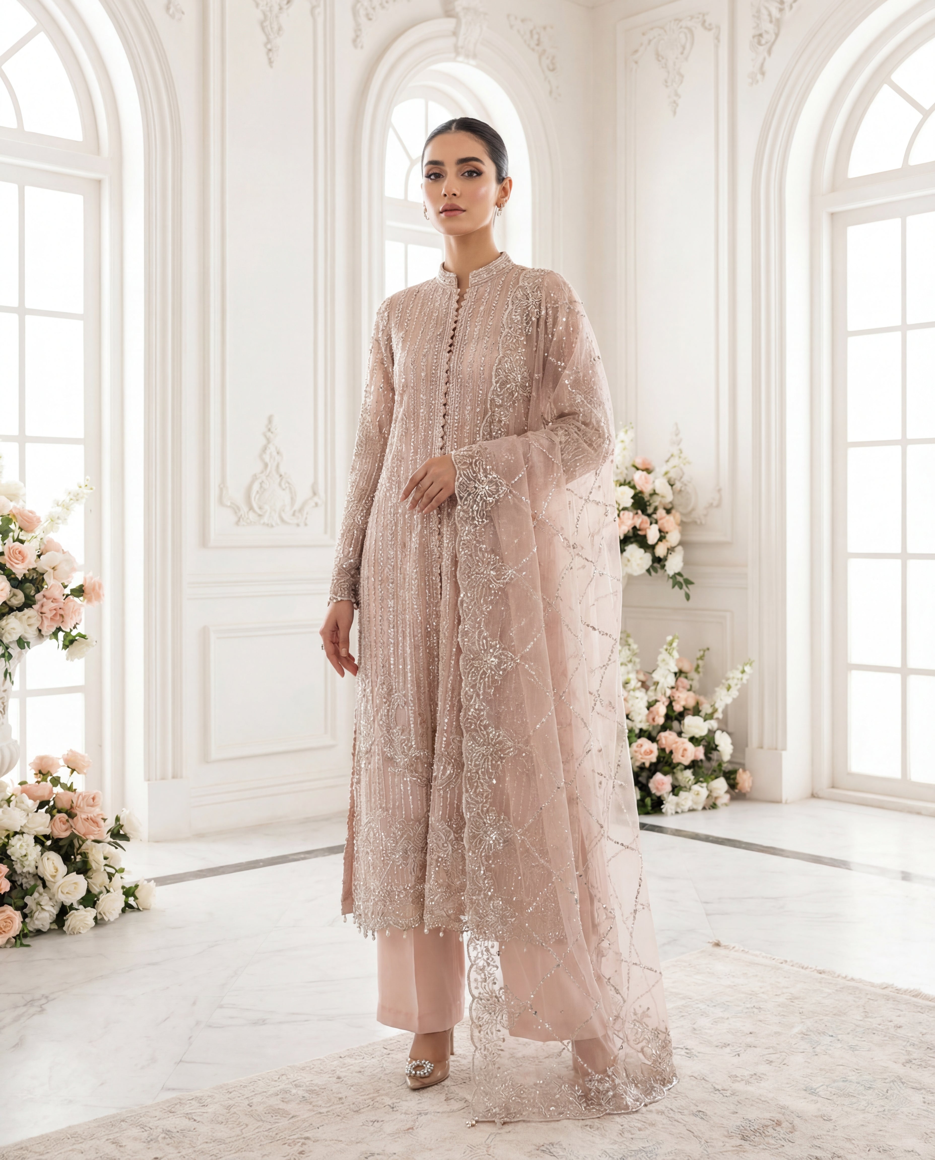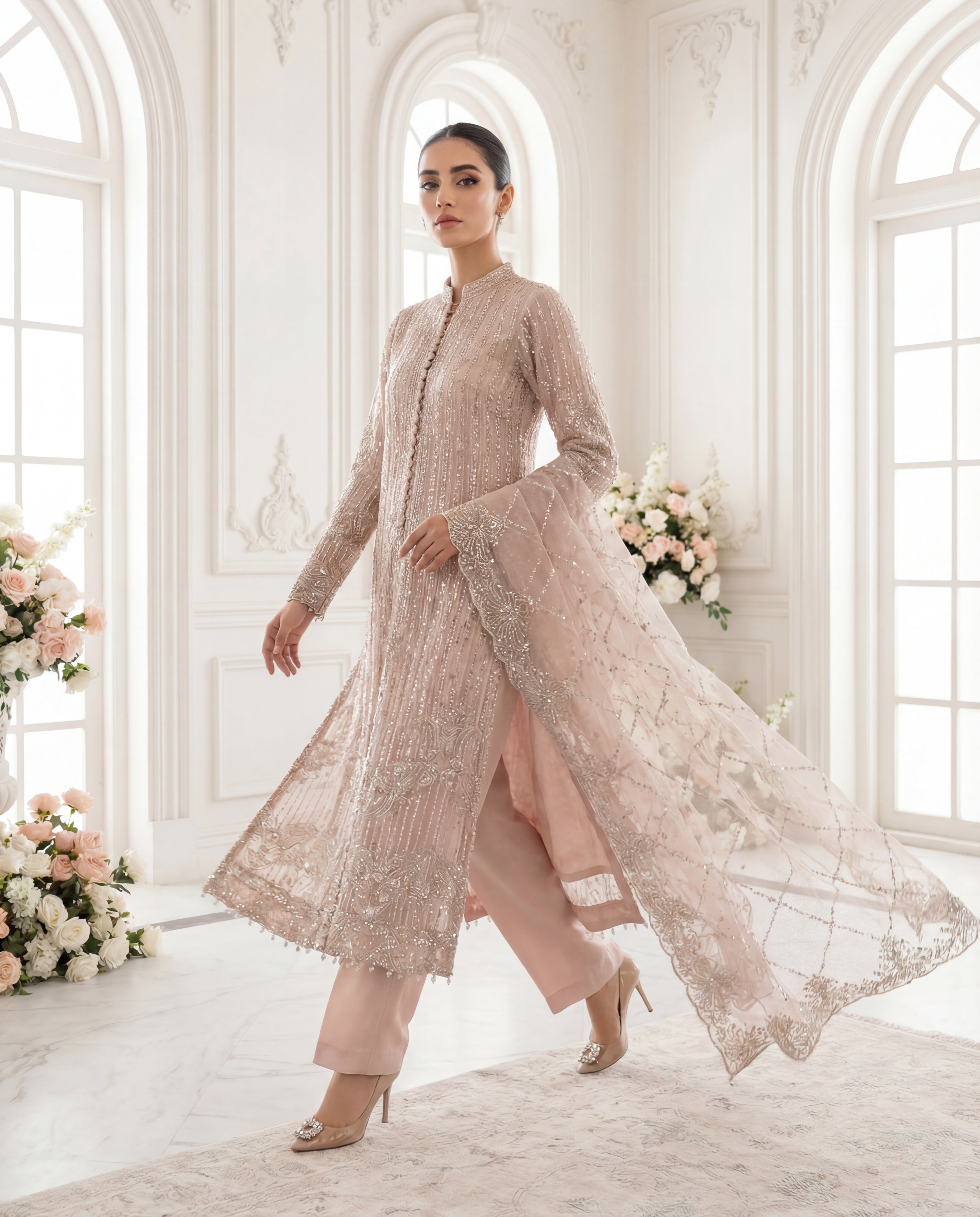 Step into the limelight with 'Seraphina Rose', a design that balances heritage craftsmanship with a contemporary editorial aesthetic. The shirt is a canvas of vertical linear embroidery that elongates the frame, adorned with shimmering sequins and crystal work. The scalloped hemline and refined mandarin collar provide a structural contrast to the fluid, diaphanous dupatta. Designed for the woman who appreciates the finer details, this ensemble radiates a soft, luminescent glow perfect for evening soirées and grand festive occasions.