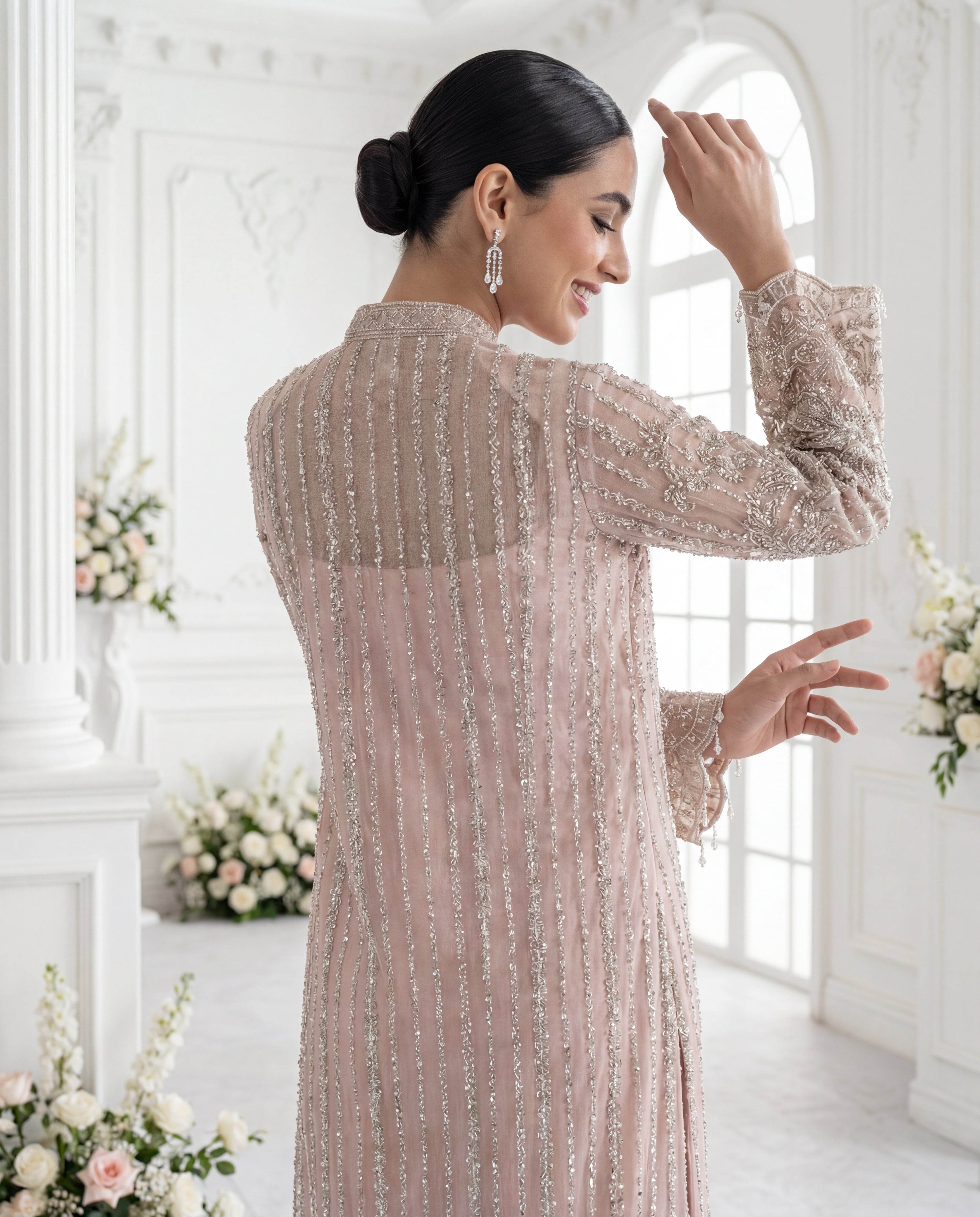 Styling Tip: Keep the jewelry minimal to let the heavy handwork shine. Opt for diamond or clear crystal drop earrings and a sleek pulled-back bun to emphasize the intricate neckline and collar detail.
